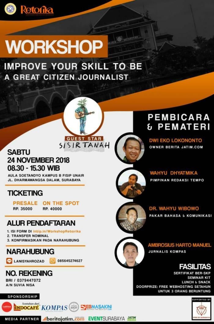 retorika.id (16/11) Kini, semua orang bisa dengan mudah menjadi jurnalis. Cukup bermodalkan smartphone dan meliput kejadian di TKP, kamu bisa menyebut dirimu sebagai citizen journalist. Namun, tetap saja kamu perlu mempelajari kaidah jurnalistik juga agar nama citizen journalist pantas untuk kamu sandang. Oleh karena itu Lembaga Pers Mahasiswa (LPM) Retorika FISIP Unair mengadakan Workshop : Improve Your Skill to be A Great Citizen Journalist yang akan berlangsung pada Sabtu, 24 November 2018 mendatang di Aula Soetandyo, Gedung C, Kampus B Universitas Airlangga.
