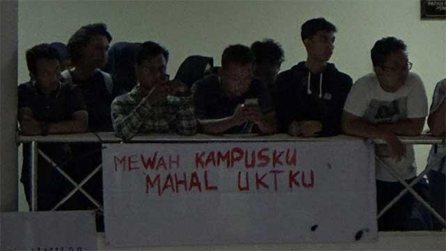 Sejumlah perwakilan mahasiswa mempertanyakan kenaikan UKT dan berlakunya UKA dalam audiensi yang berlangsung Rabu, 24 April 2019. Pada waktu yang bersamaan berlangsung aksi oleh beberapa mahasiswa di luar ruang audiensi.