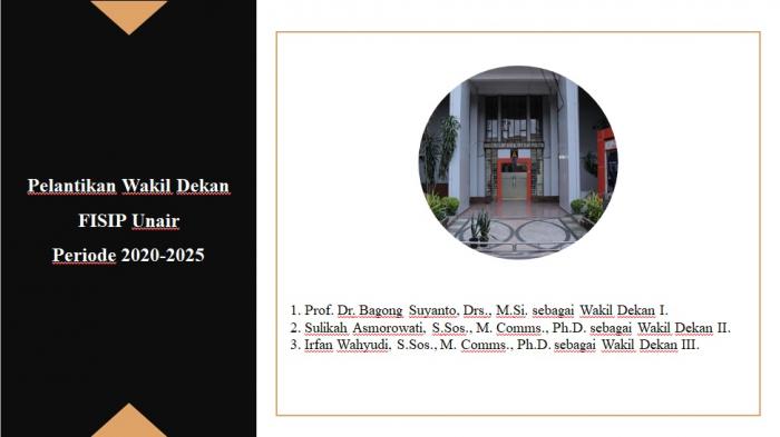 Segenap sivitas akademika FISIP Unair mengucapkan selamat dan sukses atas pelantikan Wakil Dekan periode 2020-2025. Dengan begitu, para Wakil Dekan yang baru dapat mengemban amanah dengan baik, serta dapat menjadikan FISIP Unair lebih baik ke depannya.