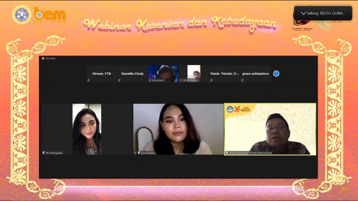 Webinar resmi dimulai pada pukul 15.03 WIB oleh moderator, Leres Anbara (Staf Ahli Kementerian Seni dan Budaya BEM FISIP Unair). Model diskusi dibuka dengan sambutan dan pemaparan dari Restu