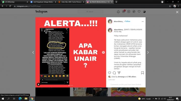 Terhitung sejak disebarkannya link pengaduan tersebut (15/8/21), sudah ada beberapa data yang masuk. “Untuk pengaduan sudah ada yang masuk dan saya akan melakukan komunikasi lebih intens dengan korban untuk memastikan keadaan korban untuk diadvokasikan,” terangnya saat diwawancarai melalui WhatsApp pada Selasa (17/8/21).