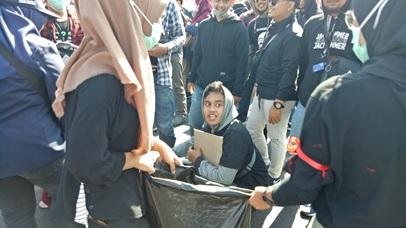 Pada aksi bersih-bersih sampah terlihat sejumlah mahasiswa yang tengah mengumpulkan berbagai tumpukan