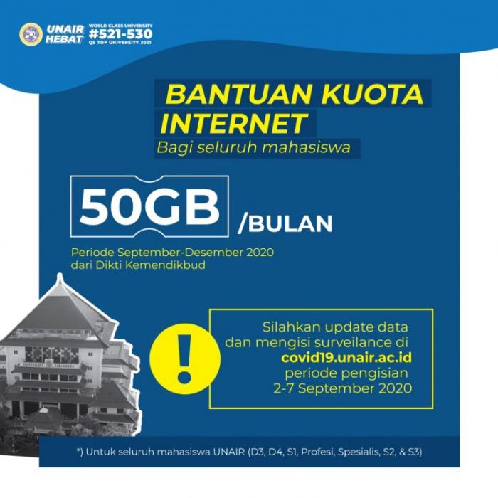 Pemberian bantuan kuota dikatakan akan berlangsung selama periode bulan September hingga desember 2020. Untuk itu, dari tanggal 2 sampai 7 September 2020 mahasiswa Unair diimbau untuk mengisi update data, seperti nomor telepon, serta survei mengenai Covid-19 pada laman covid19.unair.ac.id.