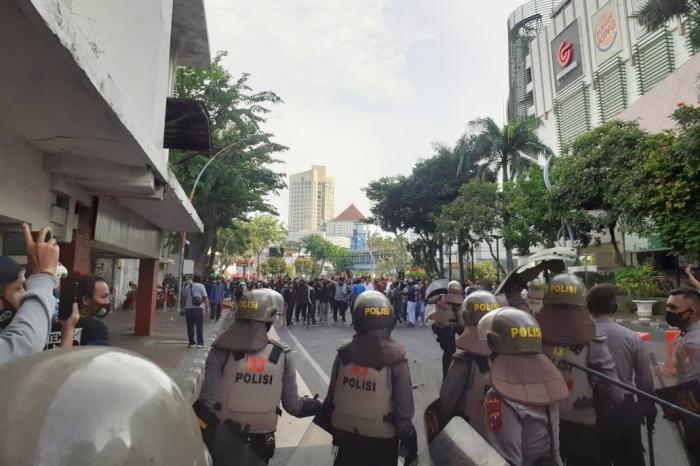 Demo Tolak UU Cipta Kerja: Polisi Paksa Mundur Massa Aksi di Gedung Grahadi Foto: Dokumentasi Pribadi/Anugerah Yulianto
