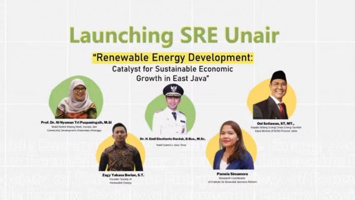 Organisasi mahasiswa Society of Renewable Energy (SRE) Unair telah resmi diluncurkan pada Sabtu (6/2/2021). Mengawali perjalanannya, SRE Unair mengadakan webinar yang bertajuk "Renewable Energy Development: Catalyst for Sustainable Economic Growth in East Java" guna mengingatkan potensi EBT. Webinar ini diadakan melalui platform Zoom Meeting dan live streaming di kanal YouTube SRE Nasional.