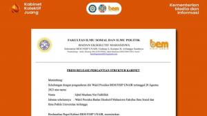Retorika.id - Press Release Pergantian Struktur Kabinet yang diunggah oleh Instagram BEM FISIP UNAIR (29/8/2023) ramai diperbincangkan. Dalam publikasi tersebut, Nupa, selaku Wapres BEM FISIP UNAIR ... » baca selengkapnya ]
