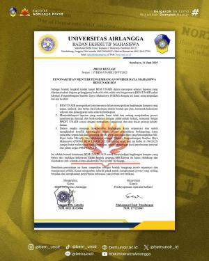 Retorika.id - Eks Menteri Pengembangan Sumber Daya Mahasiswa (PSDM) Badan Eksekutif Mahasiswa (BEM) Universitas Airlangga (Unair) dinonaktifkan sampai batas waktu yang tidak ditentukan melalui press ... » baca selengkapnya ]